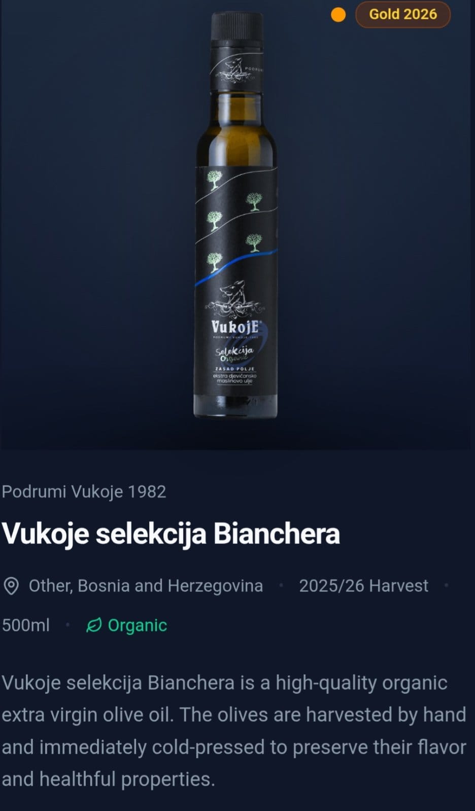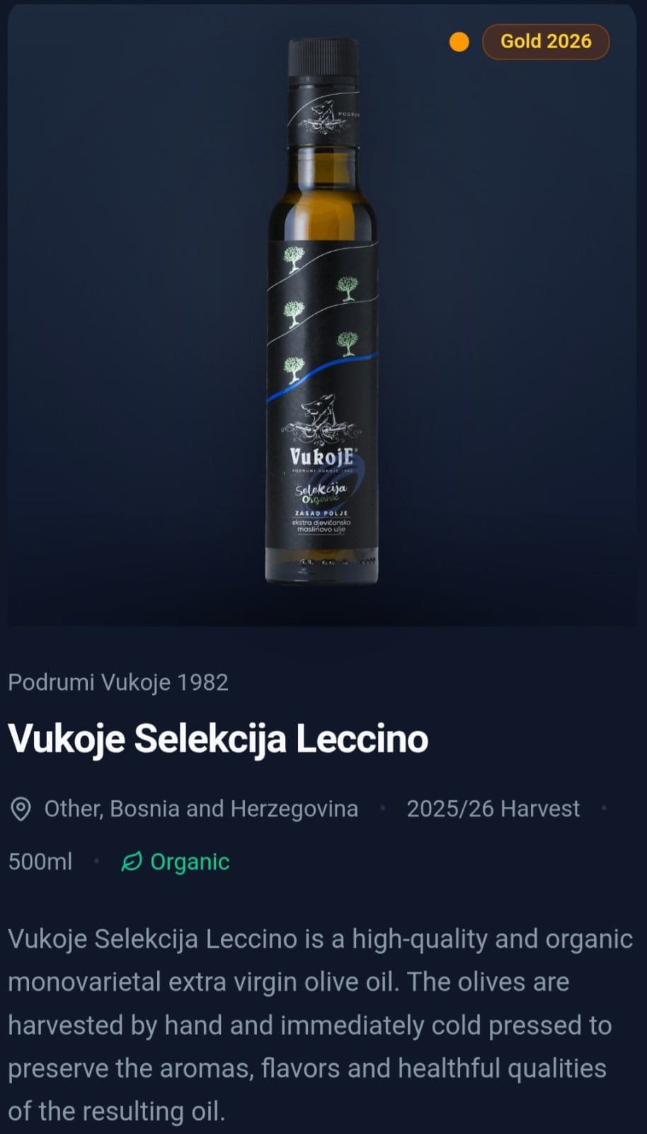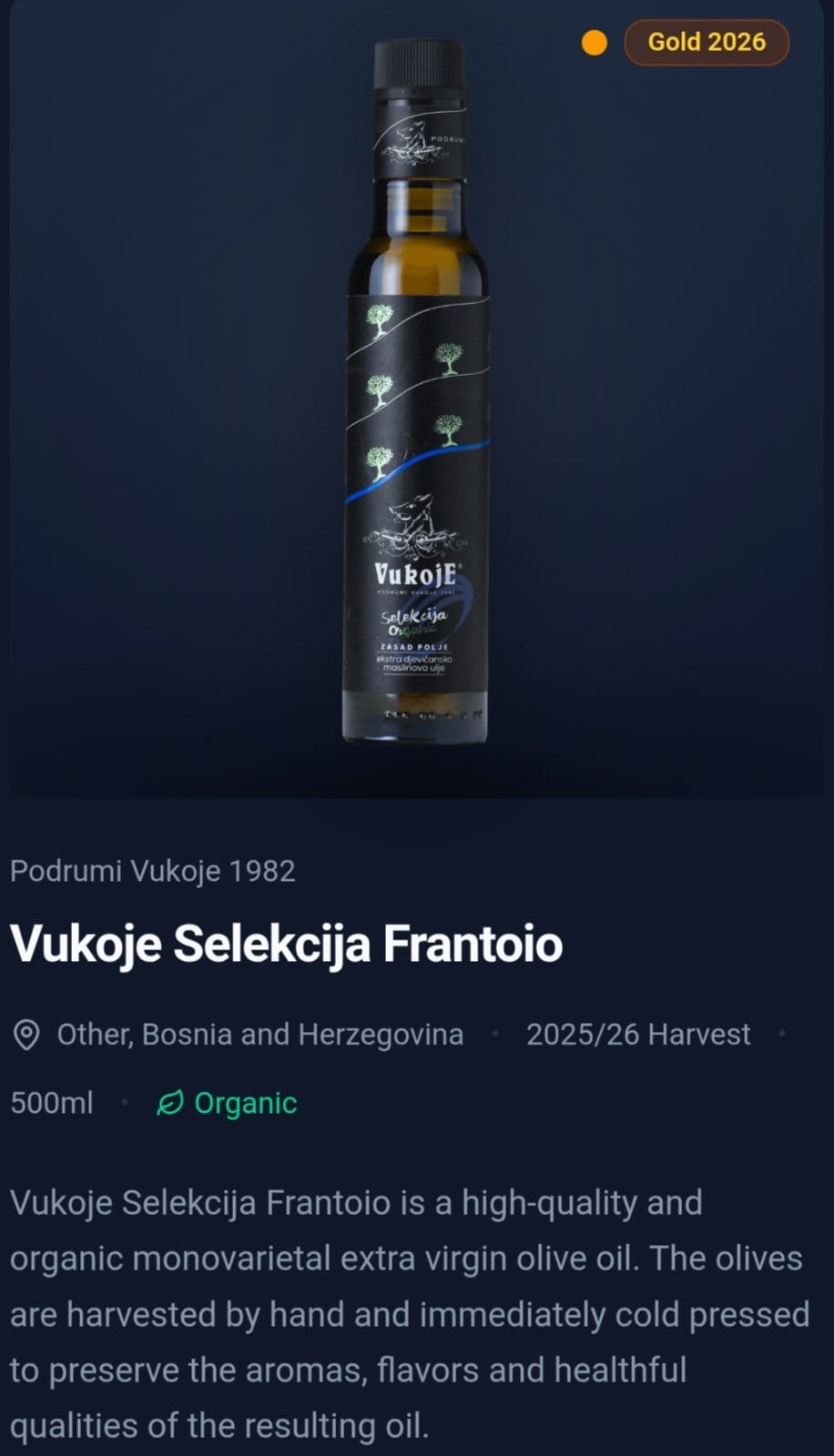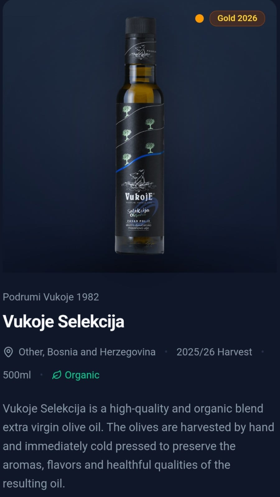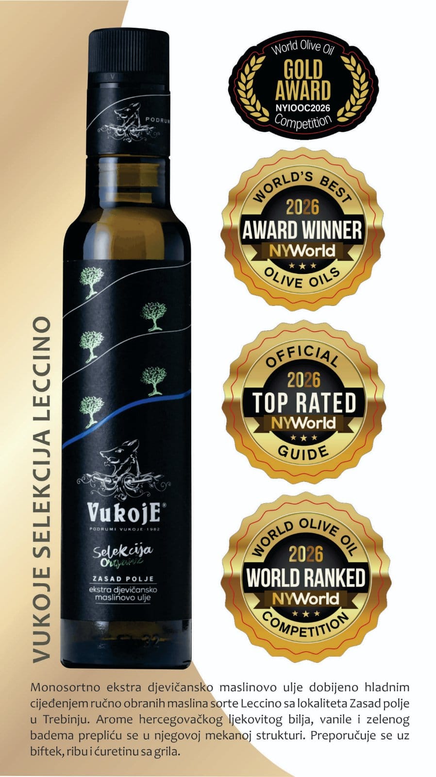 -Ove nagrade su veliko priznanje, ali i obaveza da budemo još bolji. Težimo vrhunskom kvalitetu, zbog čega berbu obavljamo ranije. Prinos je manji, ali je ulje bogatije, aromatičnije i kvalitetnije. Naši maslinjaci su u organskom uzgoju i zasađeni su prije 15 godina. Maslinjak u Zasad polju prvi je plantažni maslinjak u ovom dijelu Hercegovine, s više od 1.000 stabala. Vjerujemo da će ove nagrade dodatno skrenuti pažnju na naš rad i podstaći nadležne da pruže snažniju podršku razvoju maslinarstva. Prije desetak godina pod maslinama je bilo svega 80 hektara, dok je prošle godine na više od 500 hektara raslo preko 120.000 stabala – kaže Radovan Vukoje, vlasnik i direktor “Podruma Vukoje 1982”.